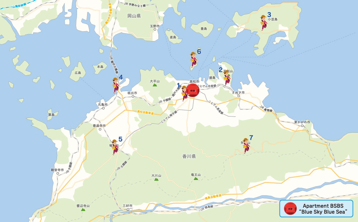 ■ Visit Megijima and Ogijima Islands, small islands in the Seto Inland Sea. Relax on the beach and walk or cycle around the islands. See fishing villages, a cat village, a lighthouse, a cave, and wonderful views of the Seto Inland Sea.