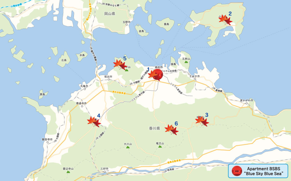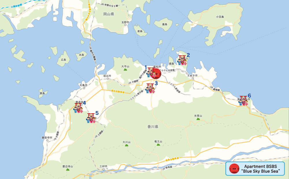 日帰りで香川県の魅力ある場所と瀬戸内海の島々へ行くことができます。また、少し足を伸ばして、祖谷、鳴門の渦、倉敷、尾道などへも出かけてください。